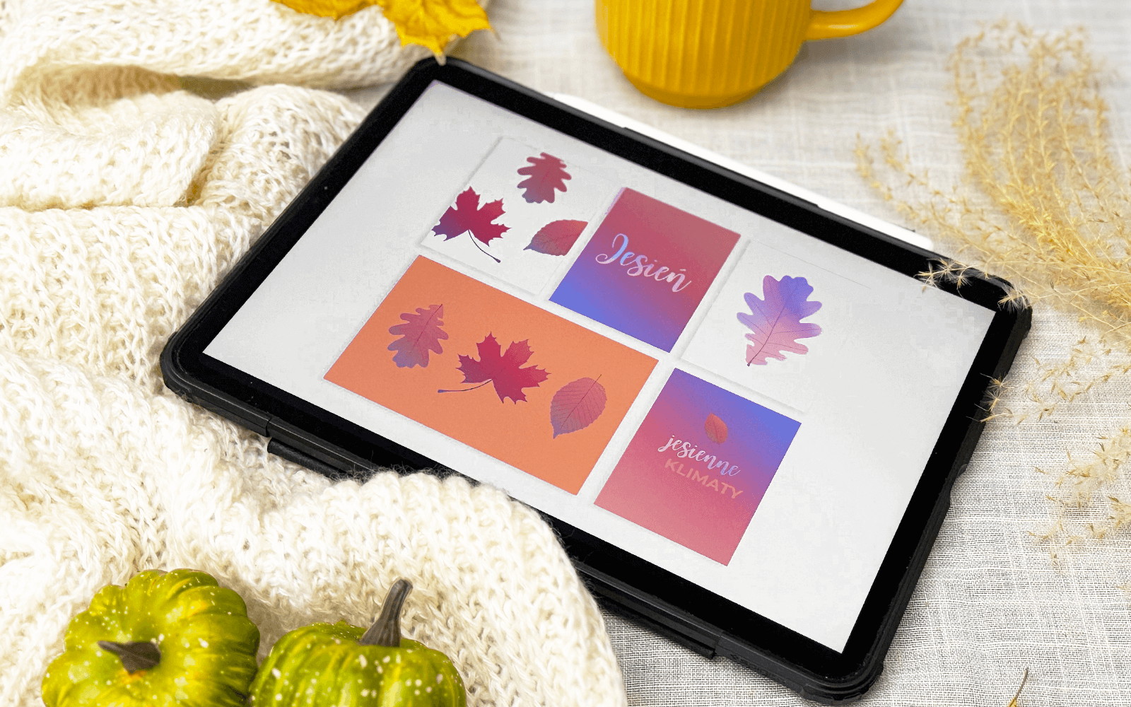 W darmowym pliku znajdziesz kilka wzorów kart w zaskakującej palecie, która mimo wszystko idealnie pasuje do jesiennej aury – czasem złocisto-pomarańczowej, czasem stalowo-szarej. Na kartach przewija się motyw liści i jesienne napisy.